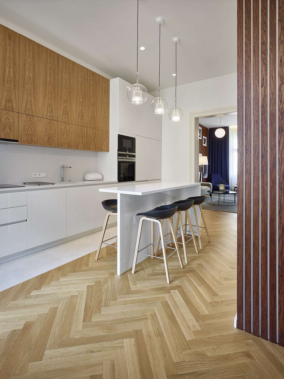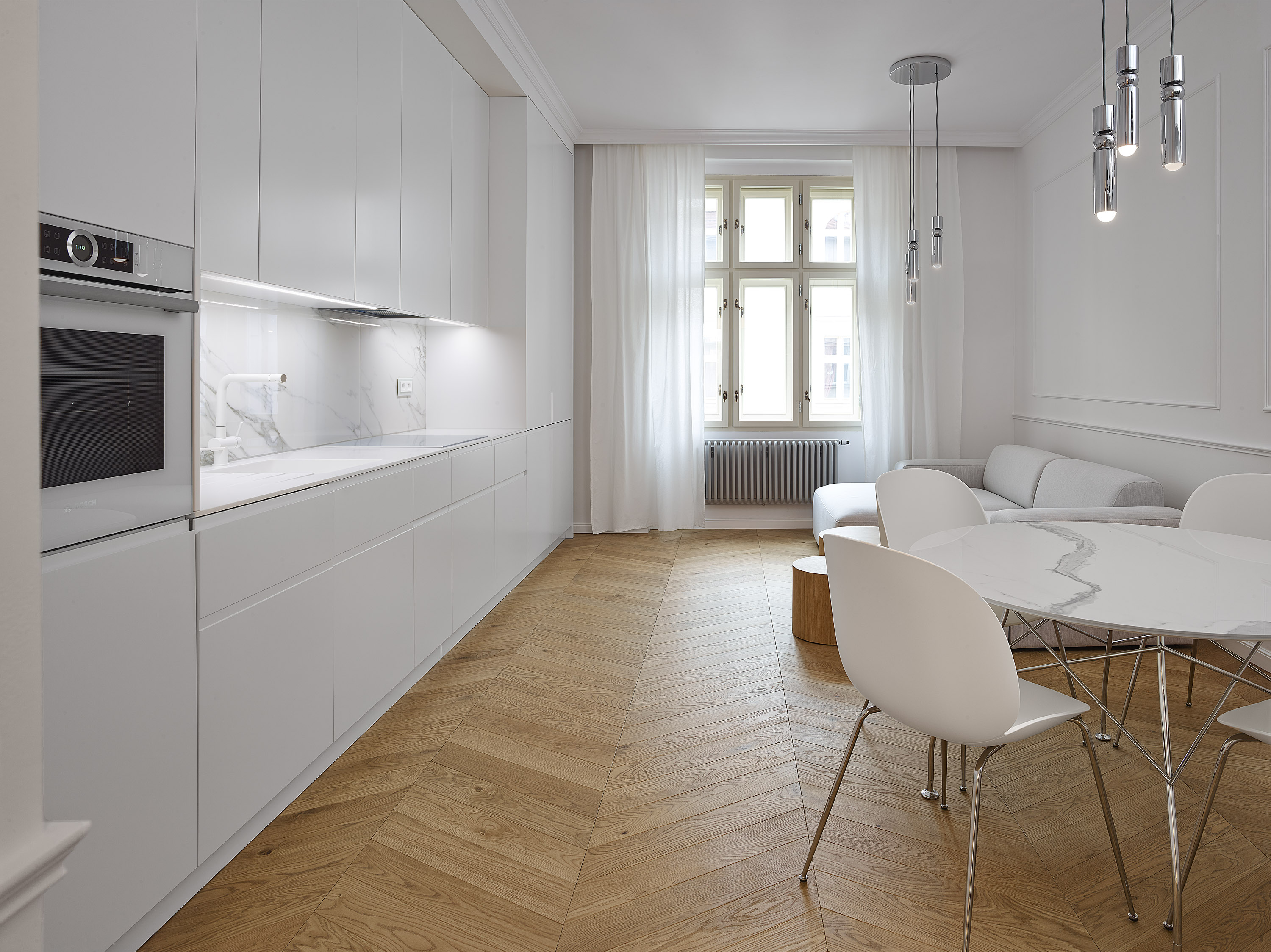Jak vypadají klasické parkety EXTORI PARQUET se můžete přesvědčit na fotografiích z realizace na Praze 5. Investor do svého stometrového bytu zvolil masivní lamely doplněné bílými lištami. Pohodlného pohybu lidí mezi místnostmi bylo docíleno bezprahového přechodu mezi podlahovými krytinami.